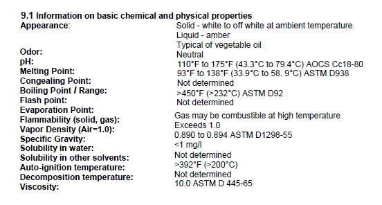 Posebno meke teksture sa veoma niskom tačkom topljenja (33,9°C - 58,9°C), i karakteristikama koje podržavaju inkorporaciju aromatičnih ulja i dobrim mešanjem sa pigmentima.